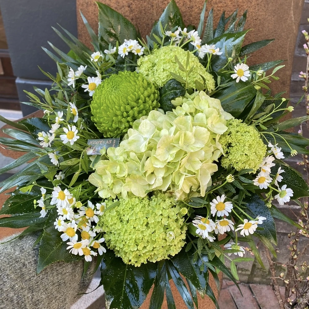 Buketten bindes med omhu og sammensættes i rolige, harmoniske farver, der symboliserer trøst, omsorg og respekt. Den kan leveres direkte til de pårørendes hjem eller afhentes i vores butik på Østergade 16 i Kolding, så du selv kan overbringe din hilsen.